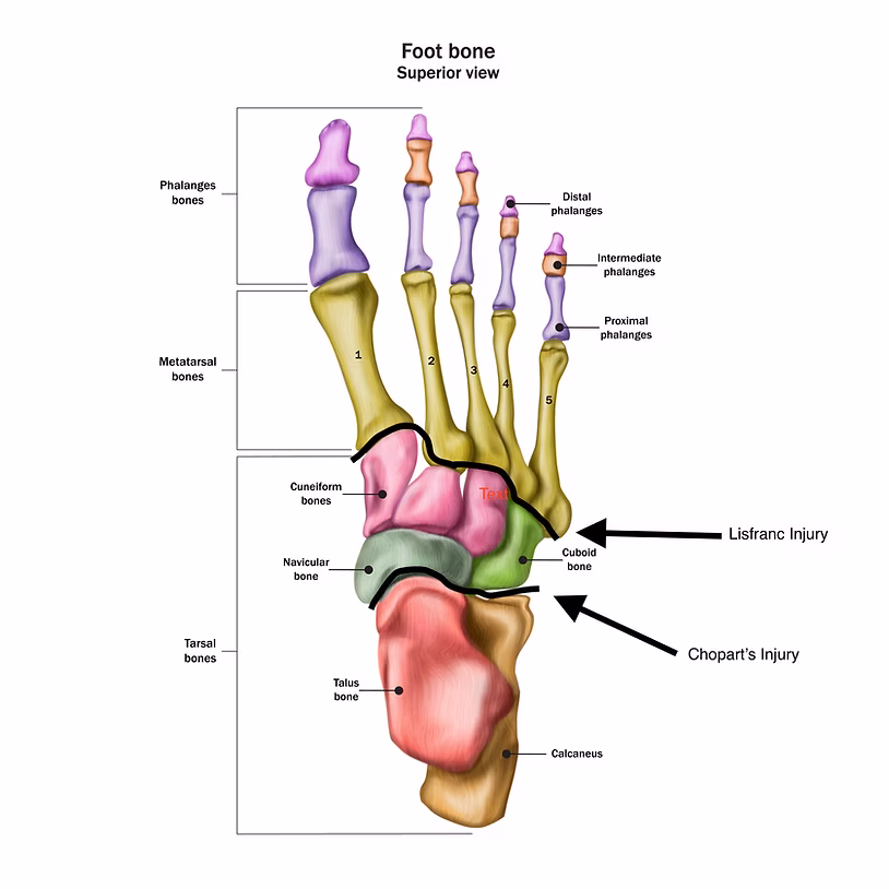 The foot is one of the more complex regions of the body. The foot has 26 bones, 30 joints, and more than 100 muscles, ligaments, and tendons. All of these structures are important because they give us stability when we stand and walk. Because there are so many structures in the feet the severity of midfoot sprains can vary greatly from a minor ligament sprain to a severe fracture dislocation with many torn ligaments. These injuries usually occur as a result of trauma to the foot and are named after the region in which they are located. If the injury occurs to the ligaments or bones in the area where our metatarsal bones meet our cuneiforms and cuboid it may be referred to as a Lisfranc injury (please see picture to the left). If the injury occurs where our navicular bone meets our talus or our cuboid meets our calcaneus it may be referred to as a Chopart's injury. When an individual suffers a midfoot sprain there may be pain and swelling in the foot and the individual may not be able to bear weight on the affected foot. Management of these injuries entirely depends on the specific case and the severity of the injury. In the cases of a mild ligament sprain we work to reduce pain, regain lost range of motion, and build strength within the foot and ankle to prevent recurrences of stress on the injured area. Surgery may be required in severe injuries that involve fractures and dislocation. The patient may undergo an ORIF (open reduction internal fixation). In this procedure the surgeon will relocate the dislocated bone (the open reduction) and then secure it in place with plates and screws (the internal fixation). After this is done the patient may be referred to physical therapy and we follow a specific protocol to reduce pain, improve range of motion, and restore strength until the patient achieves their goals. For examples of how we treat midfoot sprains in our clinic please see the photos below. If you would like to schedule an appointment please reach out to us.